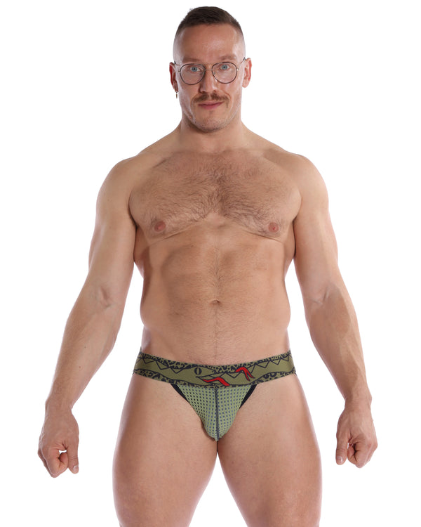 Slither in to our new sage cheetah ouroboros jock! This jock features a sage green mesh and soft cadet blue modal pouch.
