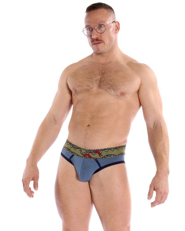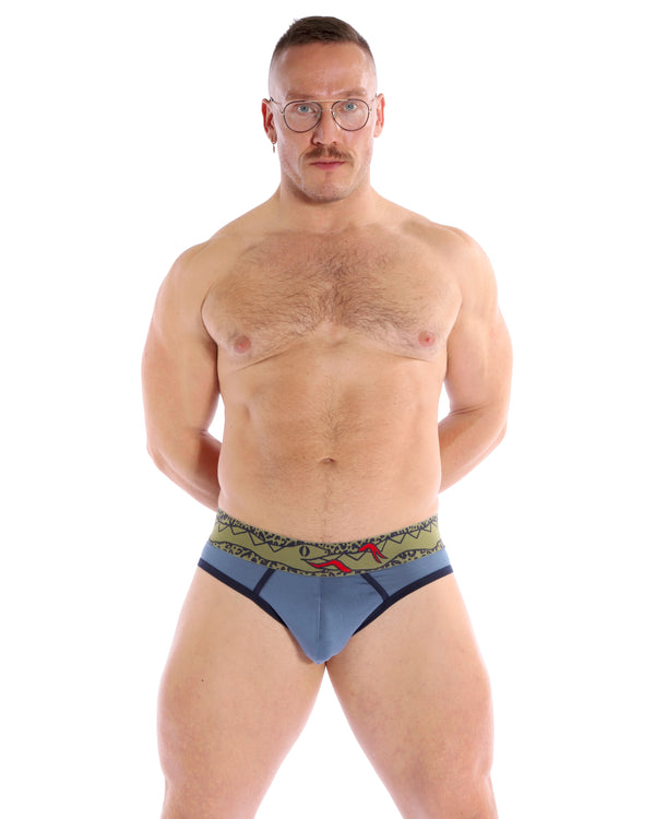 Slither in to our new sage cheetah ouroboros brief! This brief is made with super soft modal and navy cotton trim.