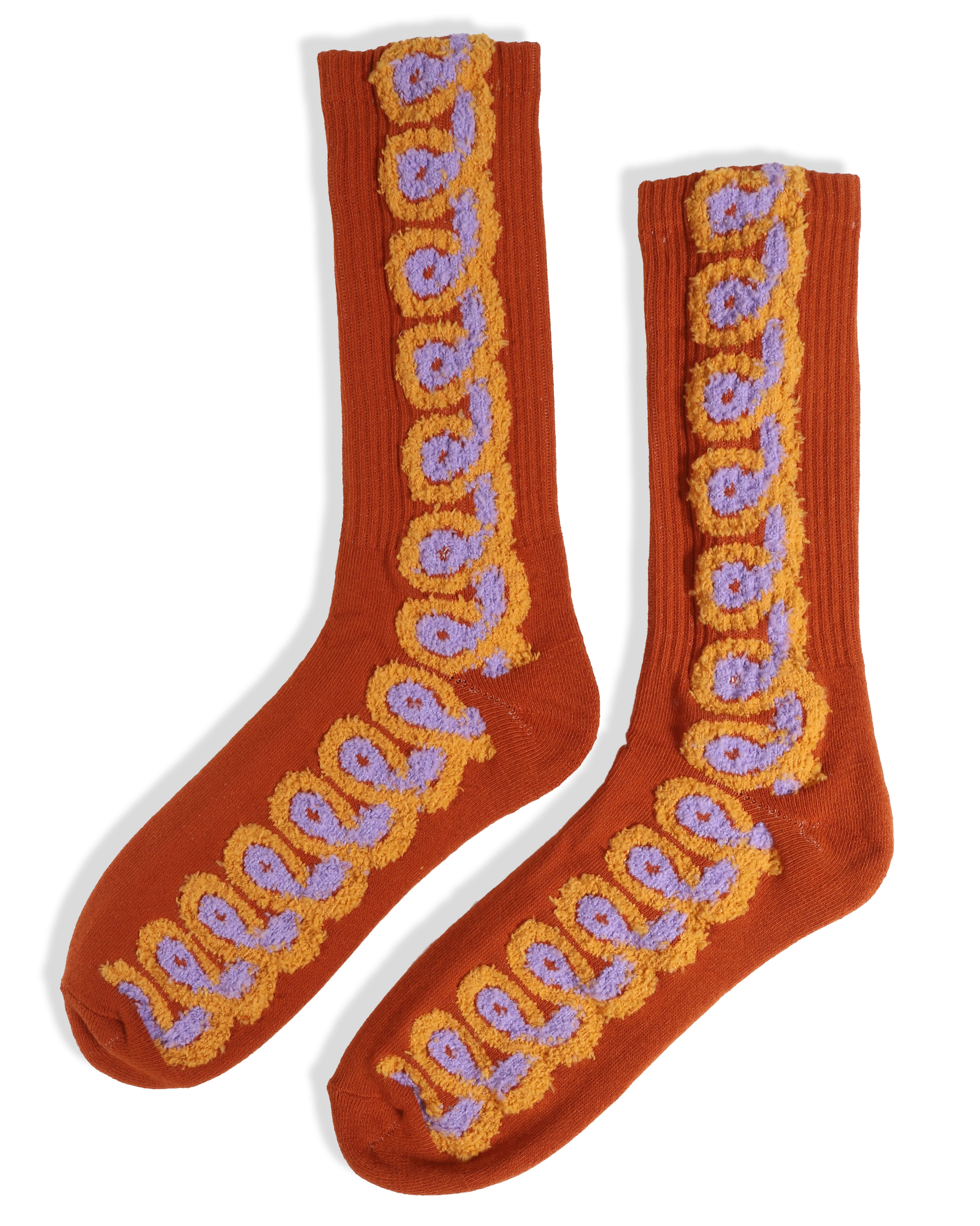 Inspired by our chenille loopy jeans, we created loopy socks! This pair is made with a umber cotton and fluffy accent yarns. Cushioned sole.