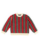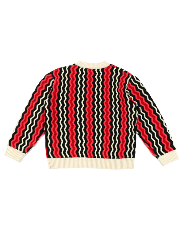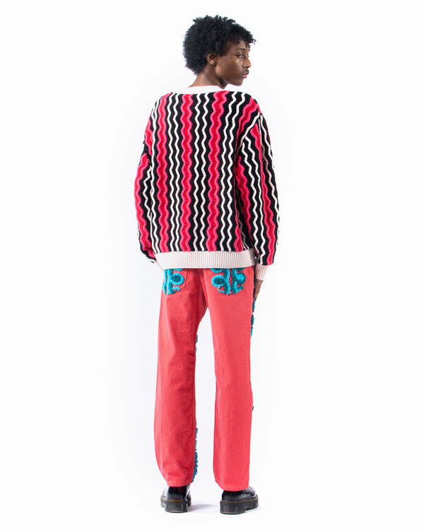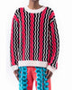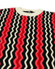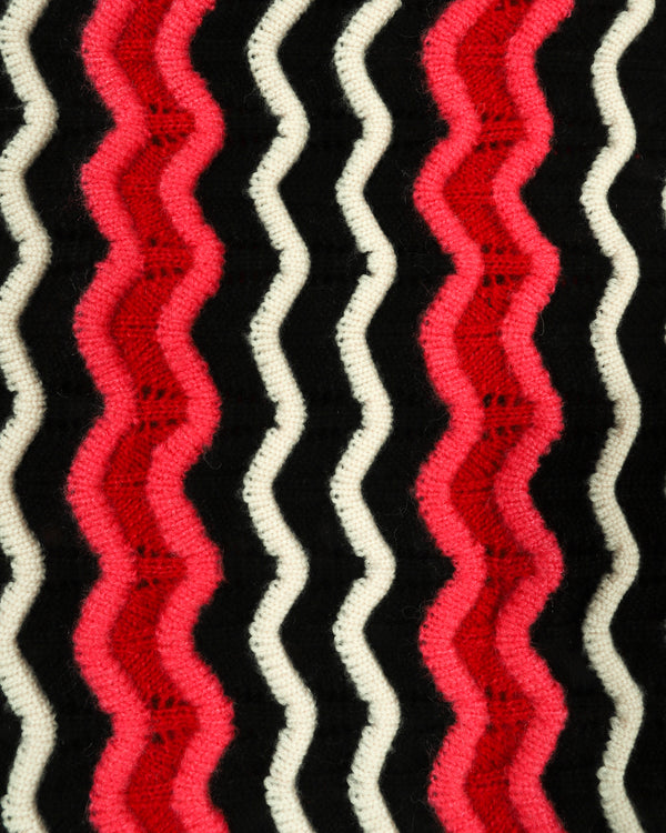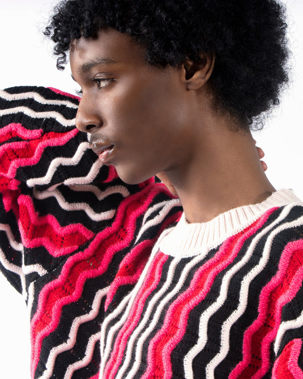 Black and off-white merino wool unite with pink and red mohair to create our radiant and luxurious Zig Zag Ottoman Sweater. Relaxed fit, mid-gauge knit.