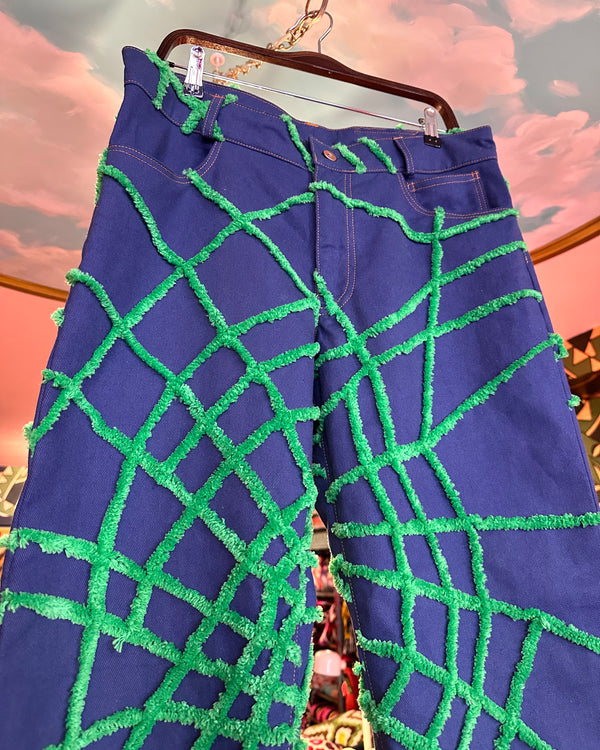 Handmade chenille spider web jean. Each pair is unique and constructed with denim embroidered by hand using antique chenille tufting machines from the early 1900's. Straight leg, mid rise.