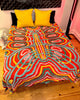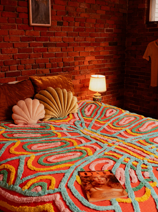 Giant chenille tufted bedspread! Hand dyed, hand woven, and hand tufted with an enormous colorful radiant butterfly! Not to mention the hand made corner tassels!