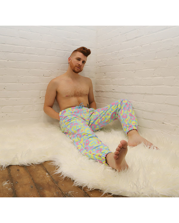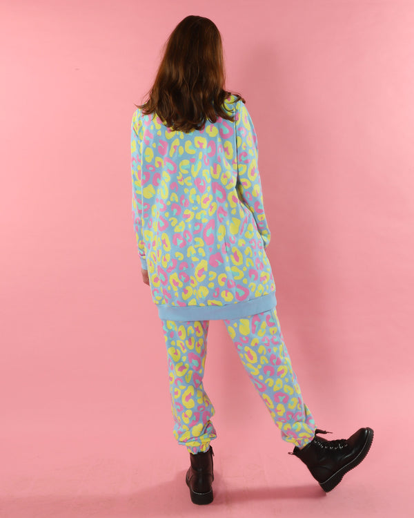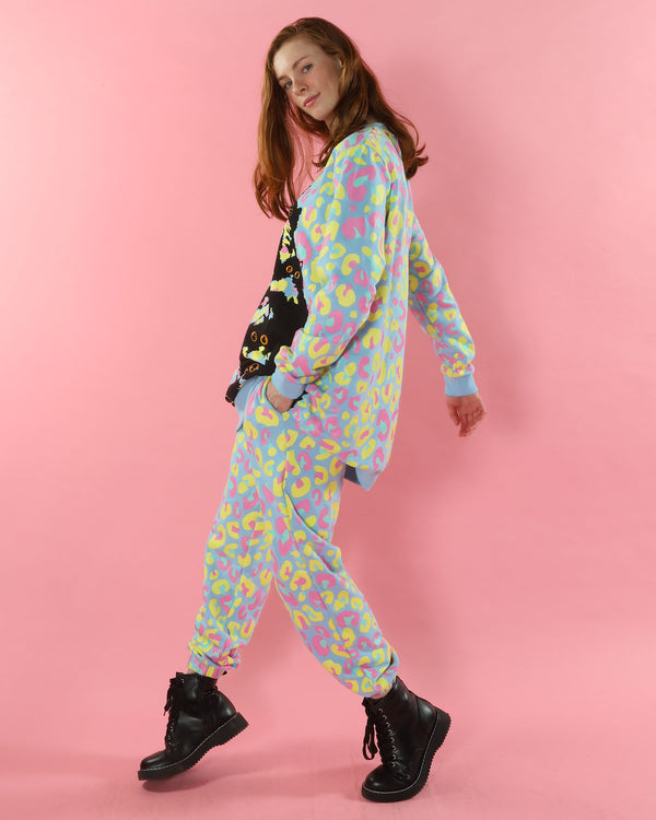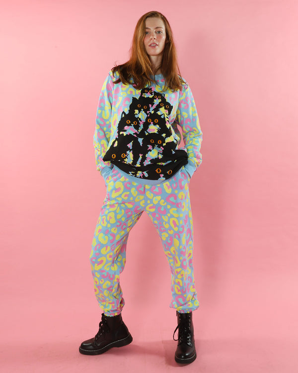 The purr-fect pairing to our Cheetah Kitty Sweatshirt has arrived! Made out of the same fabric as our cozy Kitty Sweatshirt Dresses, our deluxe sweatpants are heavyweight all-over hand silk screen printed with pastel cheetah print. They feature a high waisted fit that looks great on everyone!
