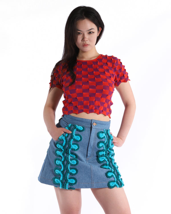 Chenille loopy skirt. Handmade with deadstock denim made in the USA, and embroidered with our refurbished antique chenille embroidery machines. Each piece is one of a kind.