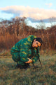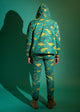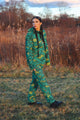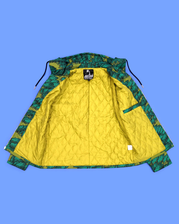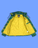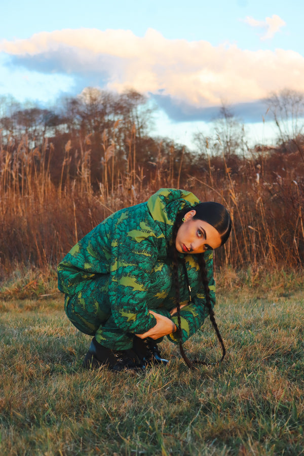 Our equinox jacket is here! Perfect for fall, spring and whenever a lightweight jacket is needed. Made from cotton, our jacket is emblazoned with a heard of glitched out horses in teal and olive. We love the fit of this jacket and it will keep you nice and warm without too much bulk. Features double welt front pockets, chartreuse lining, a golden metal zipper with Pretty Snake pull and an inner pocket to contain your secrets.