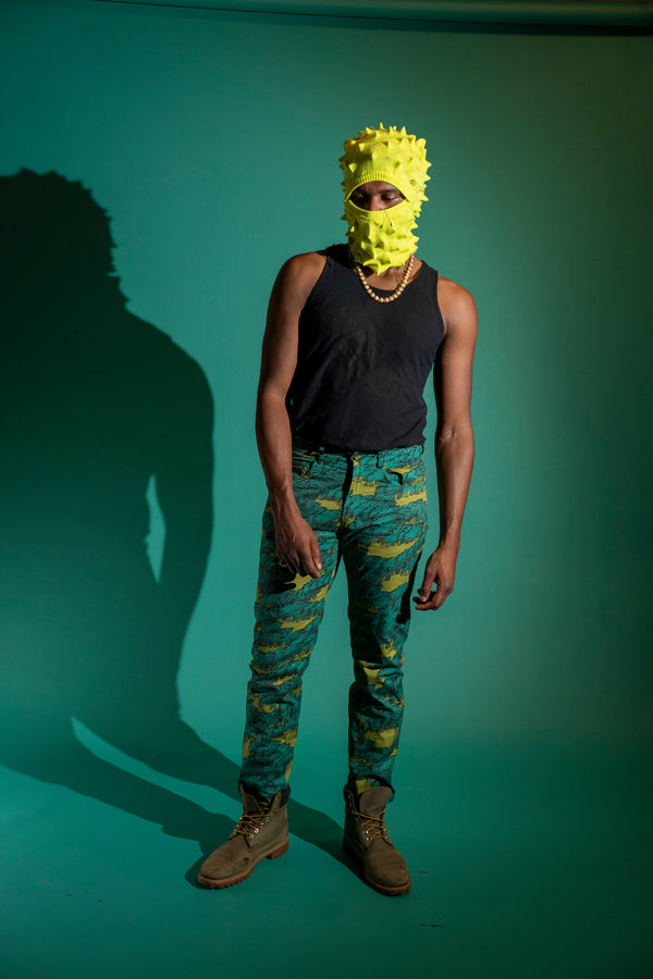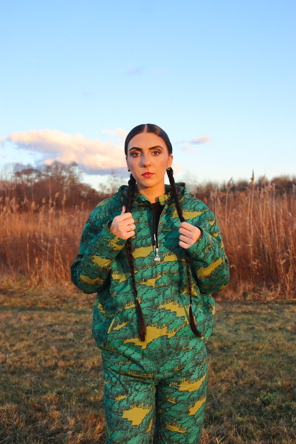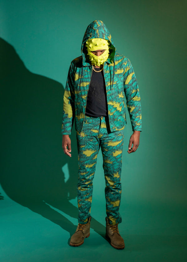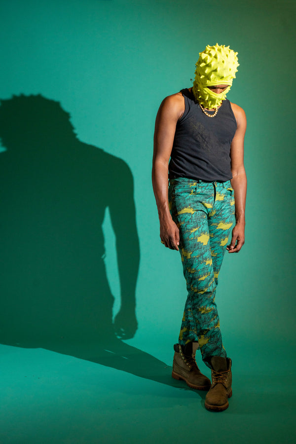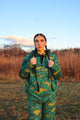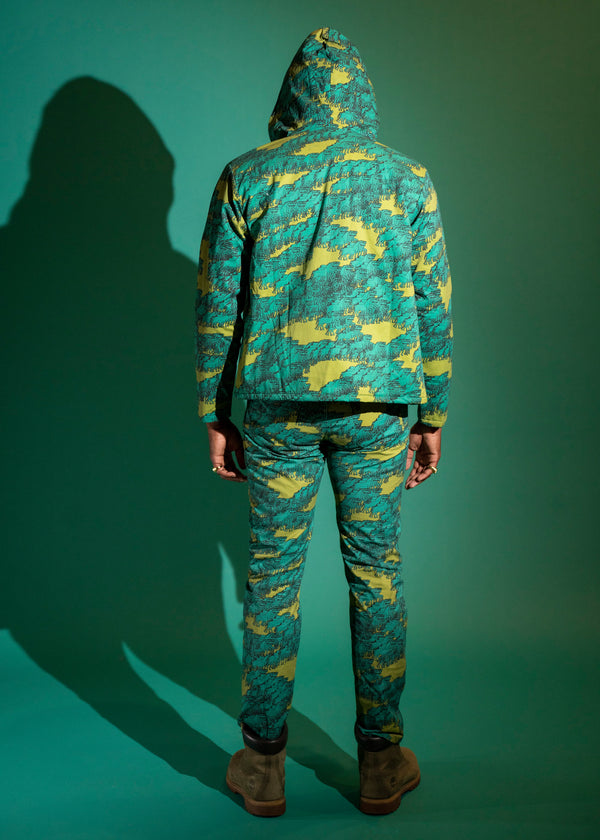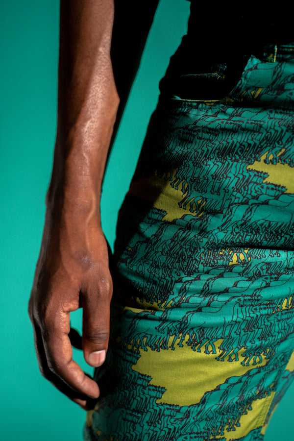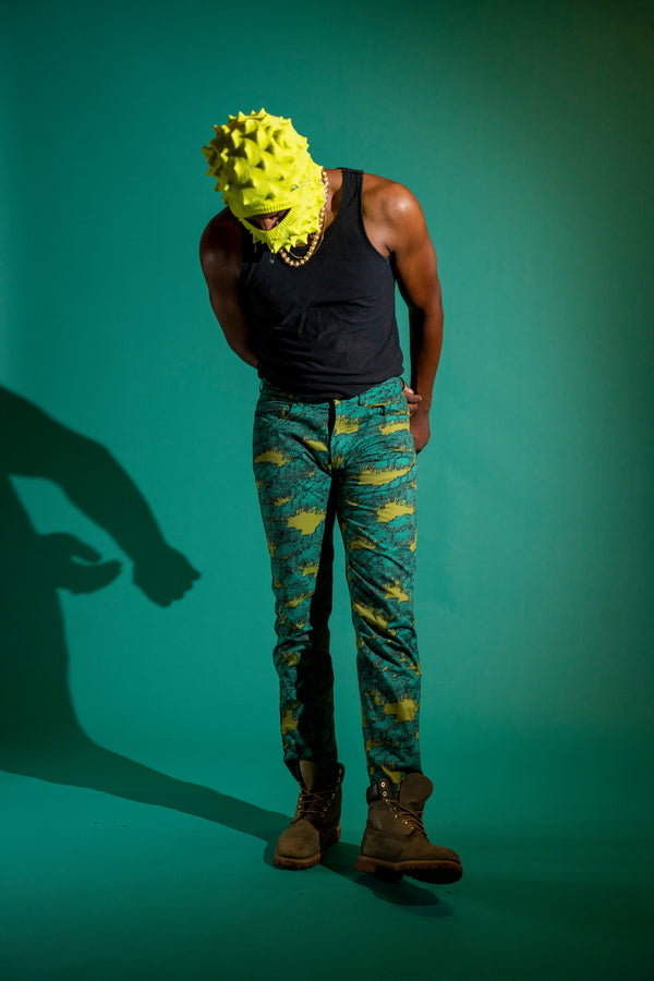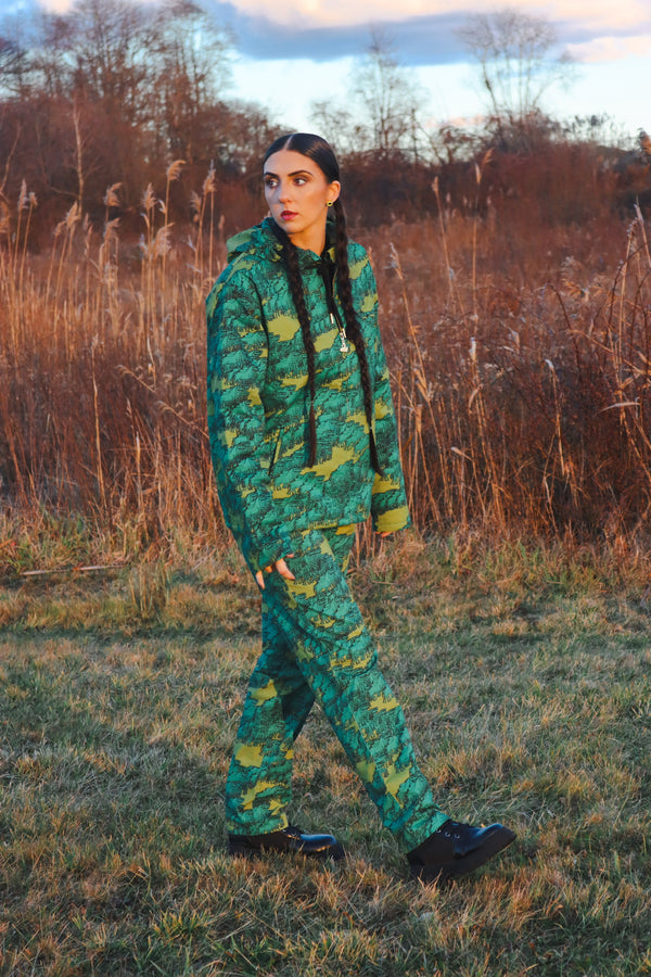 Olive and teal glitched out horse trail pants. Jean cut, zipper fly with button.