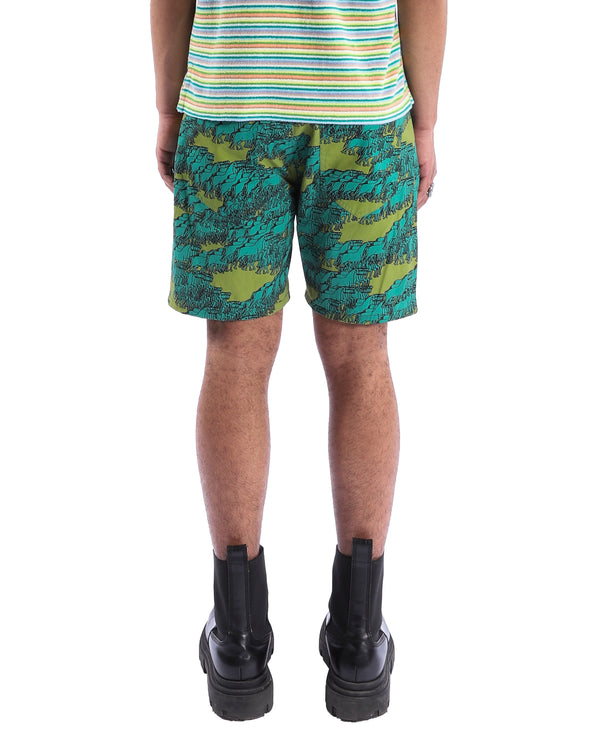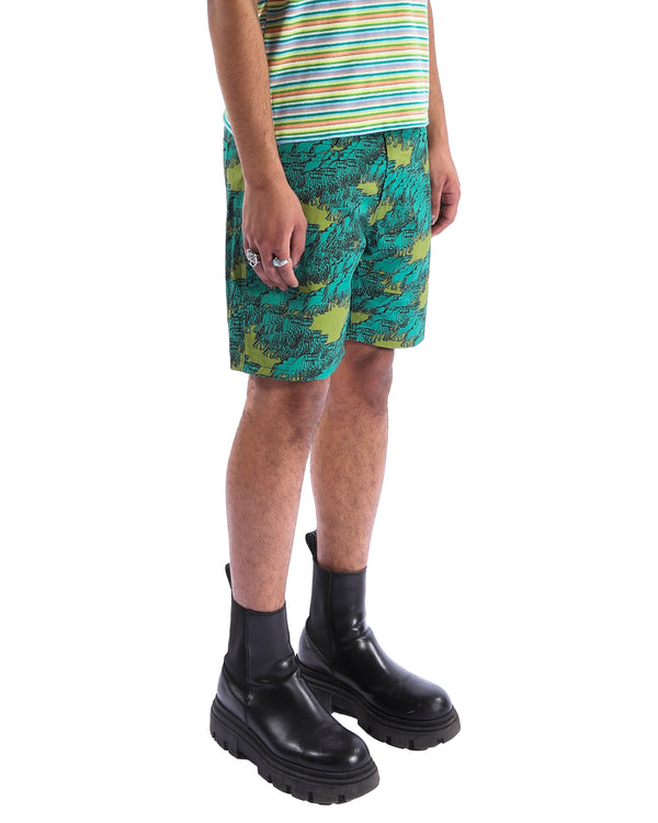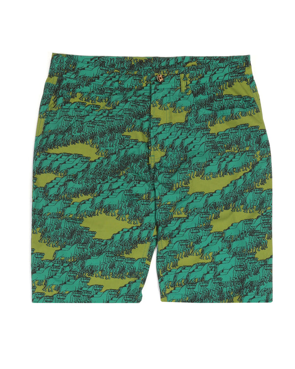 Olive and teal glitched out horse trail shorts. 7" inseam, zipper fly with button.