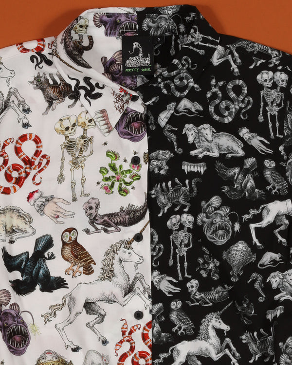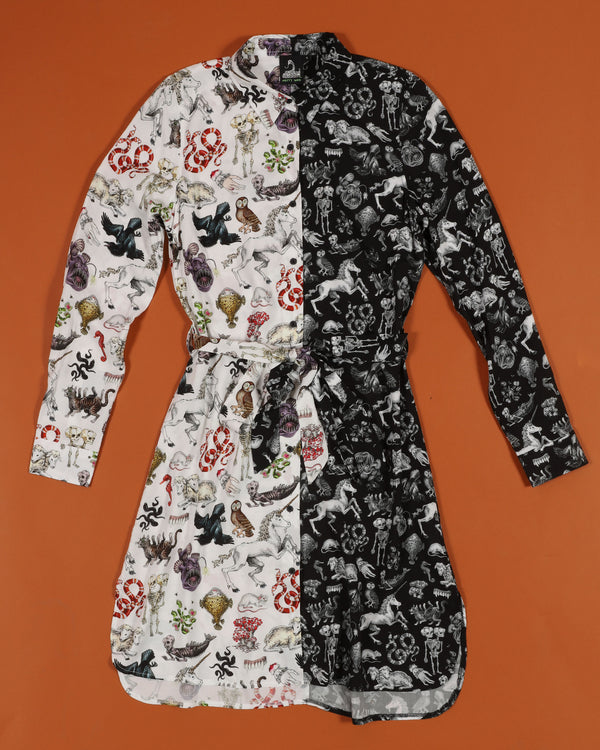 Can't decide how to get your freak on?! Then try out the hybrid Freak of Nature Shirt Dress! This new style drapes beautifully and is 100% rayon with long sleeves, collar, and fabric belt. The gorgeous oddities are illustrated by Julian Farmar-Bowers just for Pretty Snake!