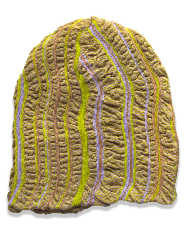 Double layered textured beanie with a littler shimmer. Inspired by morel mushrooms and opal. Lightweight and warm.