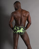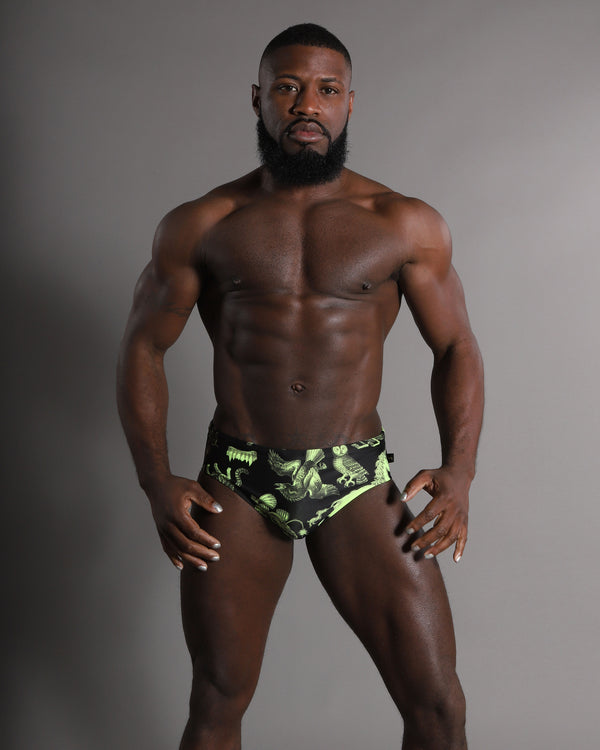 The neon freak swim brief is here! Made with a super comfy and stretchy UV reactive recycled poly spandex. Features a lined front and has inner drawstring. Made right here in our Providence, RI studio!