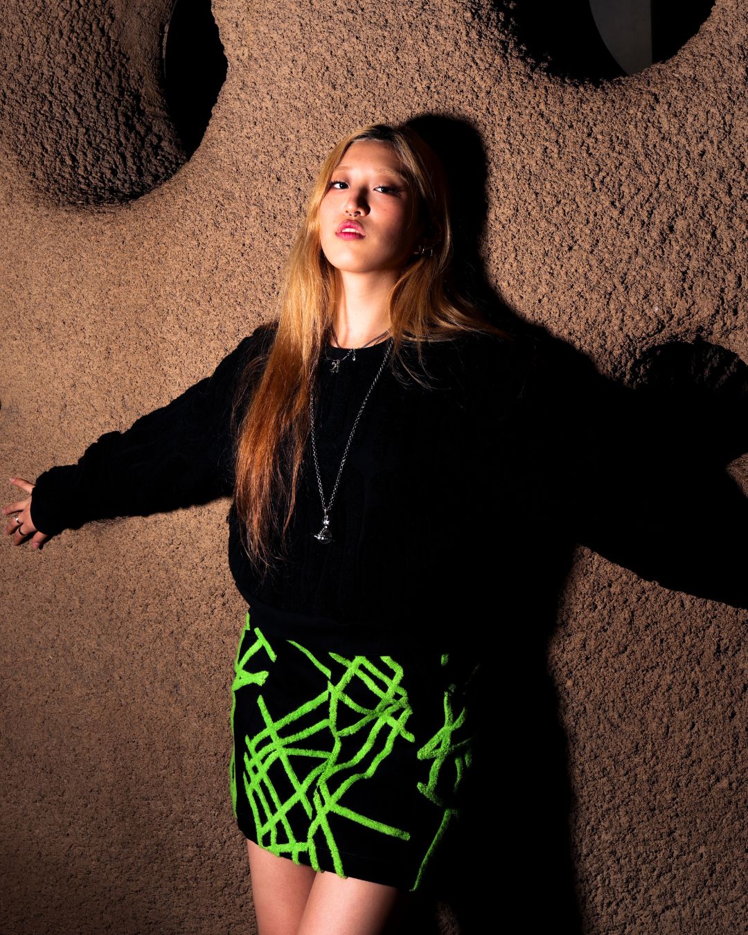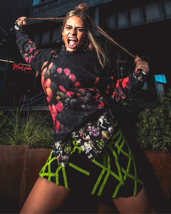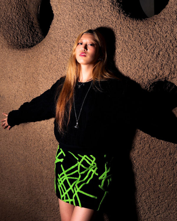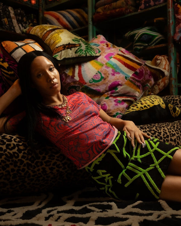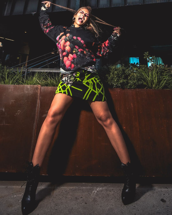 Our model is 5'8"; 36" bust, 30" waist, 41" hip and wears a size S shirt and M skirt.