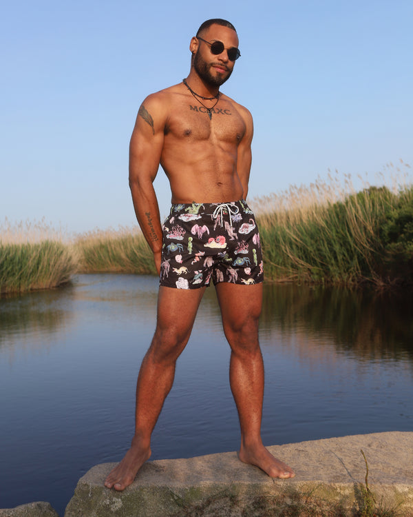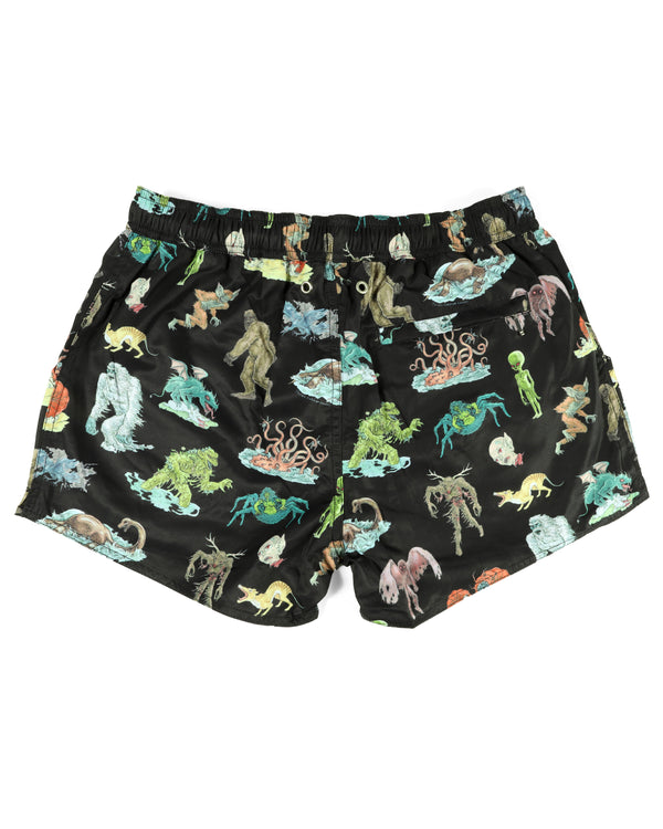Make a splash in our Cryptids swim shorts! These swim shorts are perfectly lightweight with a soft mesh lining. They also feature side and back zip pockets. Fits true to size and has a 3.5" inseam.