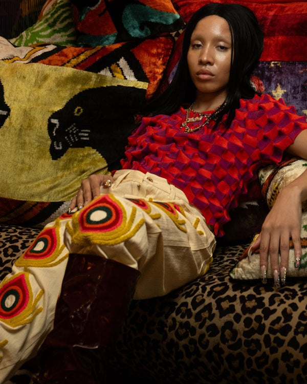 Unleash your wild side with our Purple and Orange Spiky Shirt! Cropped fit with some stretch. Order a size up for a looser fit.