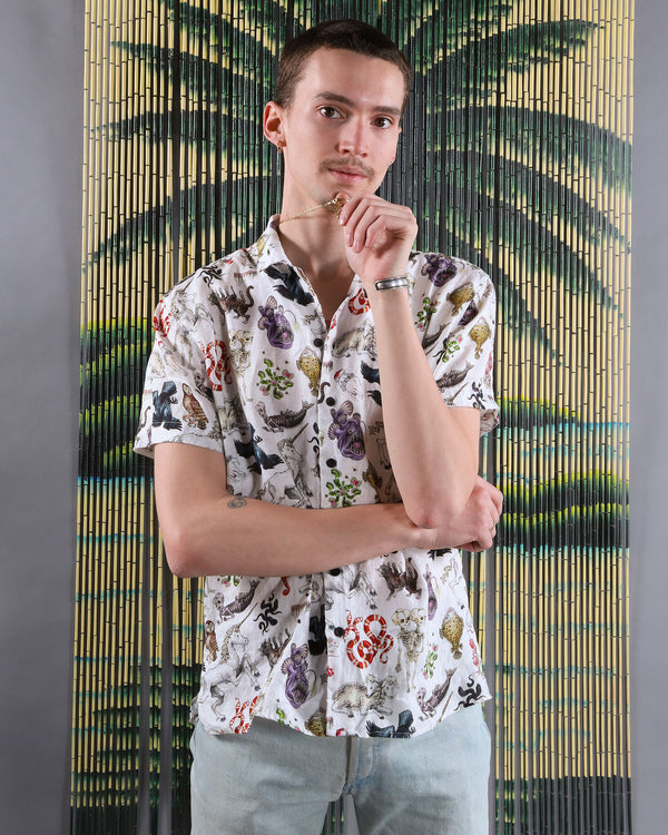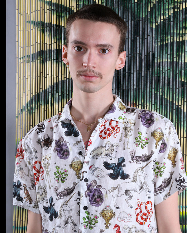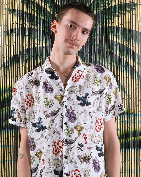 We are thrilled with the release of our linen Freak of Nature camp collar shirts! This new style has a relaxed fit and features a camp collar, side slits, and metal Pretty Snake buttons. The linen has a nice structure and cool feel, perfect for exploring nature on a hot day! The gorgeous oddities are illustrated by Julian Farmar-Bowers just for Pretty Snake.