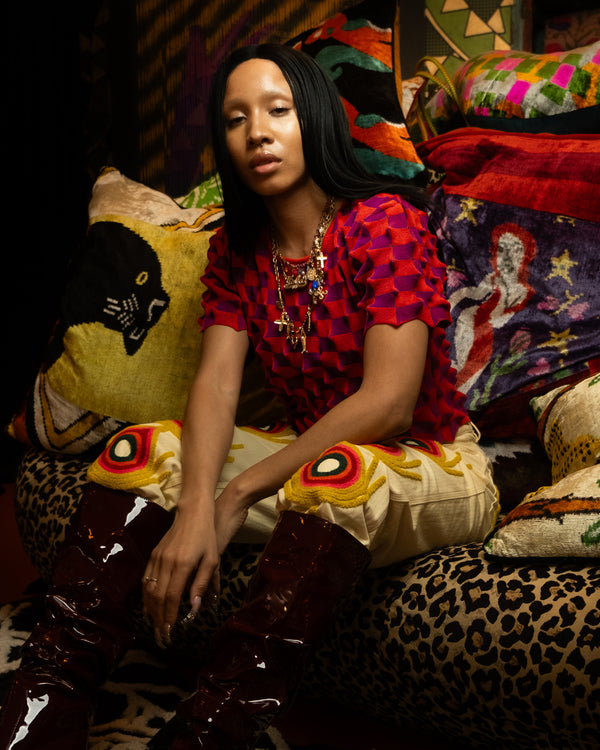 Unleash your wild side with our Purple and Orange Spiky Shirt! Cropped fit with some stretch. Order a size up for a looser fit.