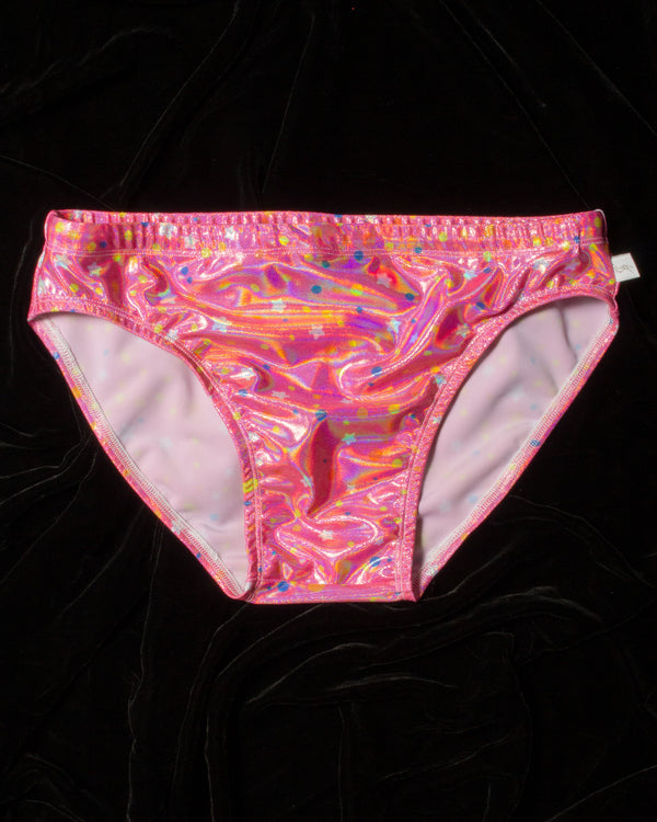 Enjoy a deep dive with our Galaxy Holo Swim Brief. Hang out in a holographic rainbow galaxy that captures the glittering stars and magical universe. Be bold and blaze your own trail to the beach. Get ready to take on a cosmically charged oceanic adventure!