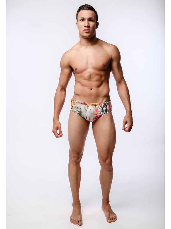 Men's kitty print swim brief. Cat placement varies per swimsuit!